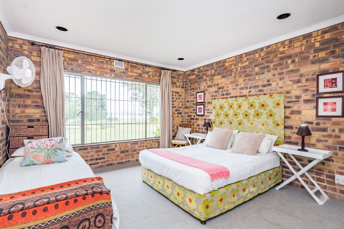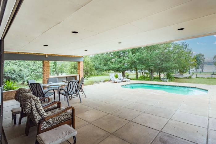 Relax lakeside with direct Vaal Dam access for fishing and water sports, west-bank convenience 12km from Deneysville — entertainer’s home featuring a private tennis court, four beds, two baths.