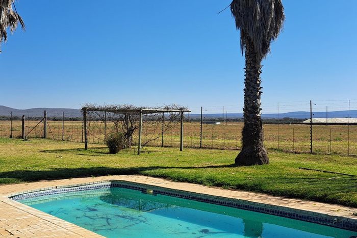 Enjoy productive farm living just 15km from Mookgopong — multiple pivot irrigators, abundant boreholes and reserve dams; includes a five‑bed, three‑bath farmhouse with pool and entertainment area.