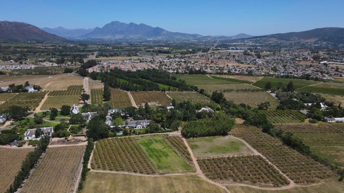 Near Pearl Valley and Val de Vie, 23-hectare Paarl farm with 5.7ha trellised vines, 8ha irrigation network and Berg River water rights — main house and workshop.