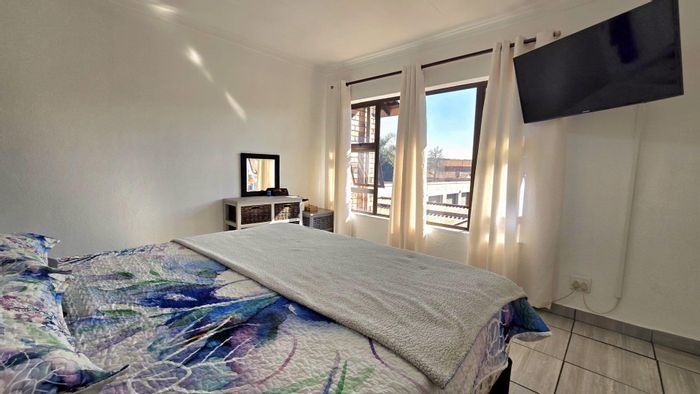 Relax in secure Clear Water complex in New Redruth, steps from New Market Park and Netcare Hospital. Upstairs two-bedroom unit with modern kitchen, tiled interiors and versatile enclosed balcony.