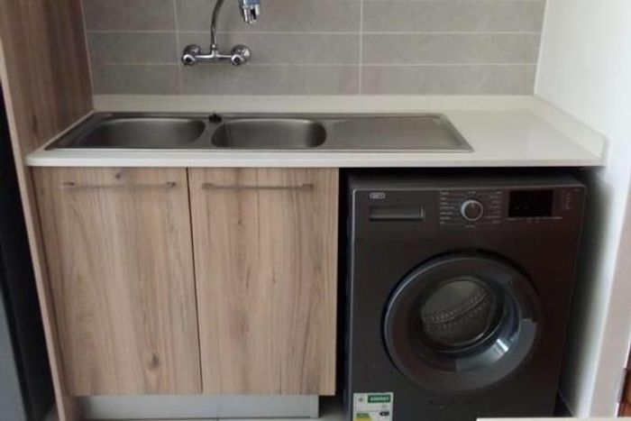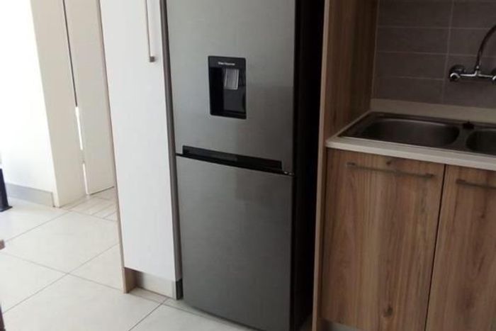 Convenient Midrand living near Sandridge Shopping Center and schools, with a modern kitchen and open-plan sitting room in a secure complex with 24/7 surveillance — two bedrooms, one bath, single garage.