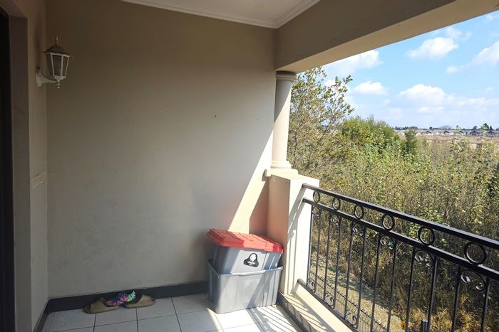 Relaxing first-floor apartment in Carlswald North Lifestyle Estate — sun-soaked balcony with built-in braai and pergola, open-plan living, access to pool, trails, and 24/7 security.