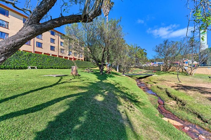 Peaceful Helderkruin living steps from Ridgeway Shopping Centre — leafy communal gardens, pool and tranquil stream. Second-floor unit with two bedrooms and one bathroom.