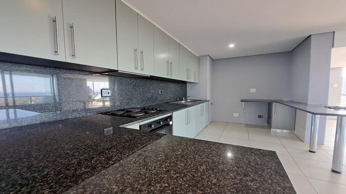Coastal luxury living with panoramic canal and ocean views at Quayside, Point Waterfront; steps to Durban's Golden Mile, featuring a sunlit balcony, modern fitted kitchen, three bedrooms, two bathrooms.