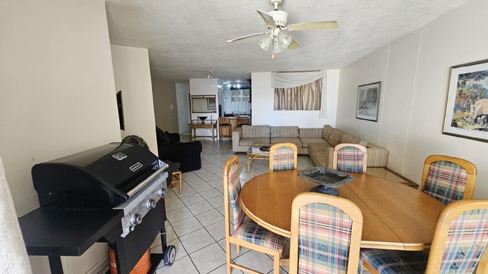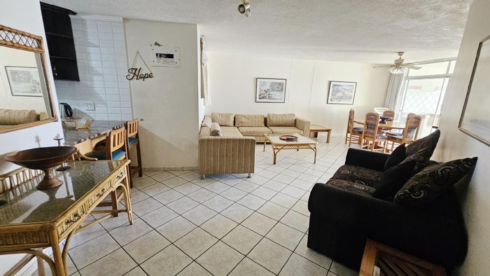 Sun-soaked coastal living moments from Margate's main beach and historic pier, with a spacious balcony overlooking the ocean, pool and braai area — three beds, two baths, two covered parking bays.