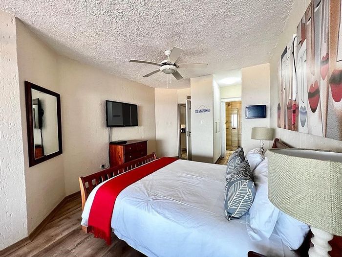 Stunning Uvongo apartment with ocean views, open-plan design, three bedrooms, solar power, and direct beach access. Fully furnished.