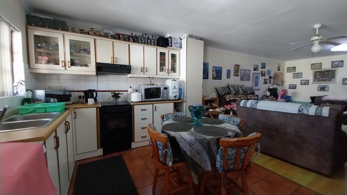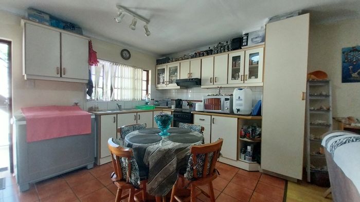 Relaxed coastal living in Manaba, steps to Lucien Beach with a private gate, panoramic sea views, semi-covered patio with built-in braai, communal pool; three-bed, two-bath, lock-up garage.