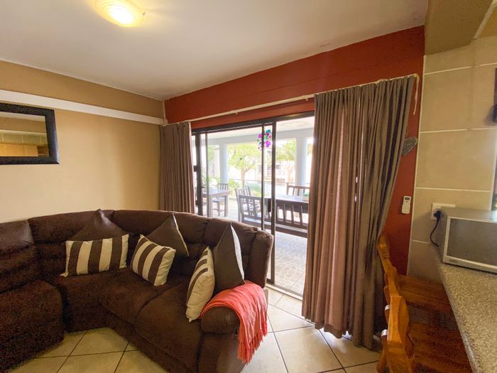 Coastal lock-up-and-go living in Sea Breeze West, steps from Margate’s Blue Flag beaches and eateries; fully furnished two-bed, two-bath ground-floor unit with covered braai patio and garage.