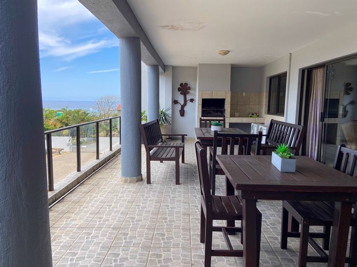 Beachfront living steps from Uvongo Beach, with panoramic sea views and a vast undercover balcony featuring built-in gas and fire braai — fully furnished, three bedrooms, two bathrooms.