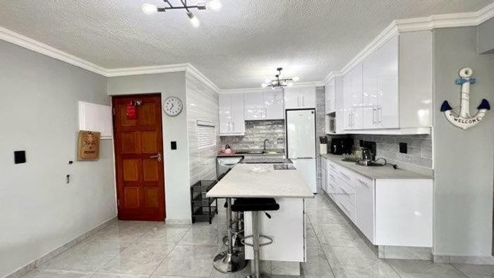Seaside living steps from Uvongo Beach with panoramic sea views from a spacious covered balcony; newly renovated with quartz-topped kitchen island. Three bedrooms, two bathrooms, sold furnished.