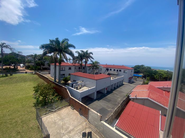 Relaxed seaside living in Uvongo: top-floor apartment with private balcony and slight sea view, fully furnished and move-in ready. Two bedrooms, one bathroom, communal pool.