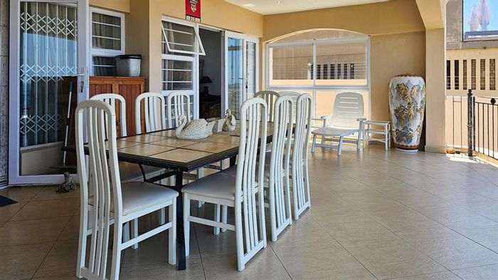 Seaside holiday living in Uvongo, Margate — furnished three-bedroom, two-bath unit with expansive entertainer’s balcony, bar and built-in braai offering 180° ocean views in a secure complex.