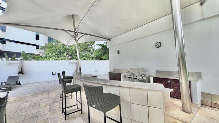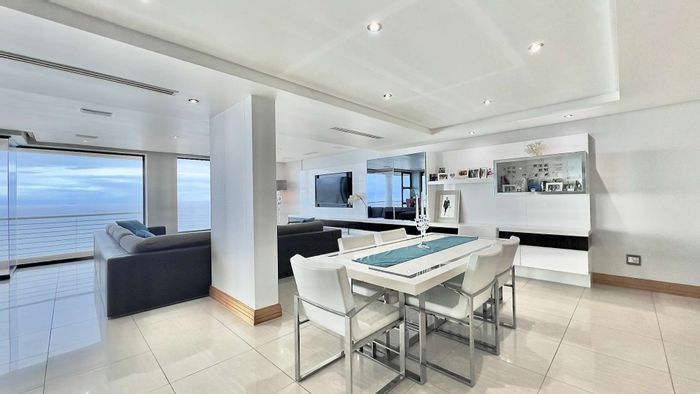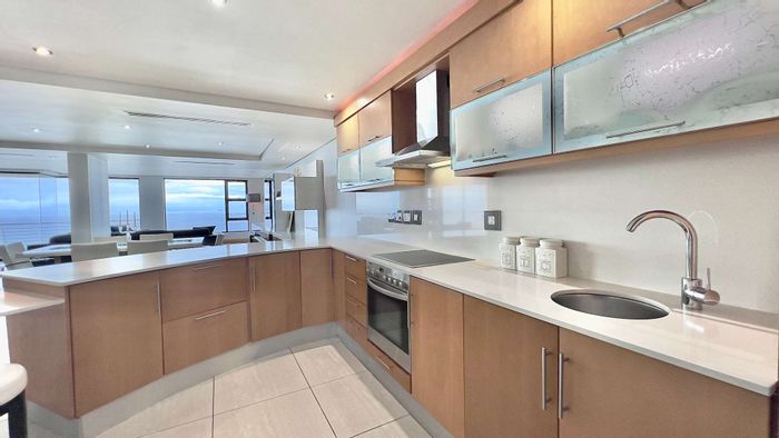 Resort-style coastal living in Umhlanga, steps from Pearls Mall and the promenade, with a sprawling 35m² balcony offering sweeping ocean views; fully furnished, three en-suite bedrooms, two covered parking