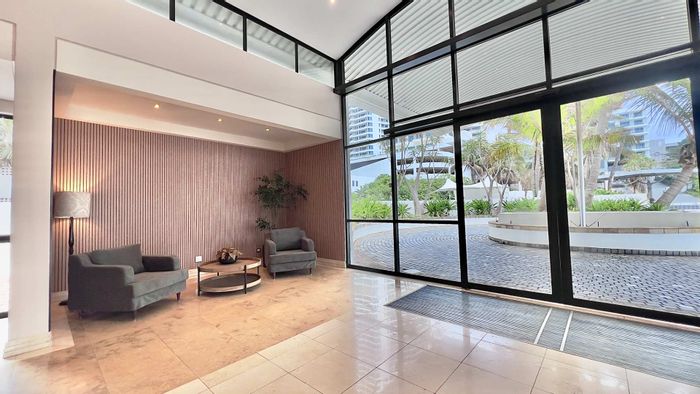 Seaside living steps from Umhlanga promenade and Pearls Mall, relax by hydrotherapeutic heated pool with Indian Ocean views; ground-floor apartment offering open-plan living, two beds, two baths, covered parking.