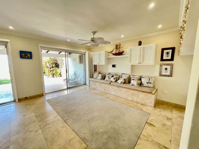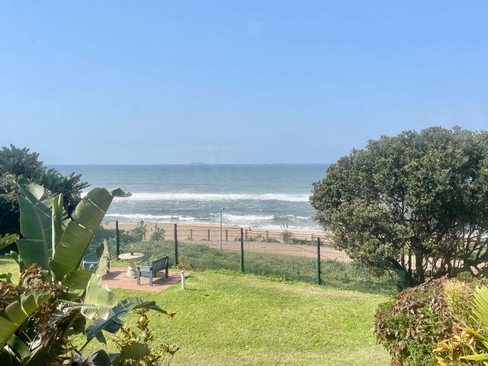 Directly on Umhlanga Beach, this ground-floor family apartment offers a 38m² patio and private lawn for children, resort-style pool with sea views — two en-suite bedrooms, covered parking.