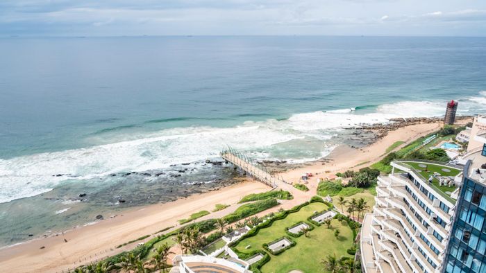Beachfront lifestyle on Umhlanga Promenade, steps from Umhlanga Village and Pearls Mall; 32m² balcony with sweeping Indian Ocean views, three bedrooms, 3.5 bathrooms and two covered parking.