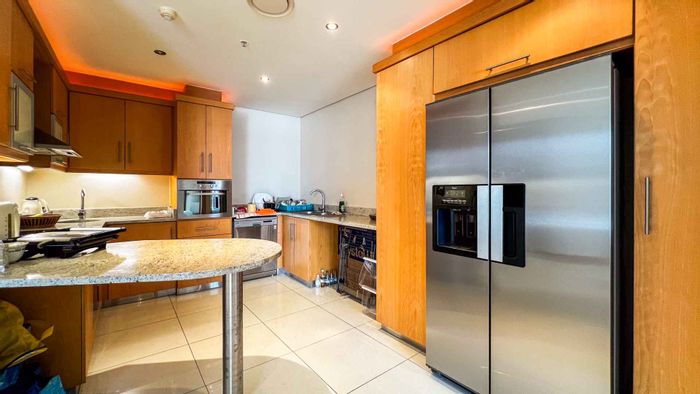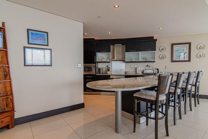 Coastal resort living in prime Umhlanga Village with direct beach access and uninterrupted ocean views; furnished three-bedroom, 3.5-bath apartment featuring a gourmet kitchen and two garages.