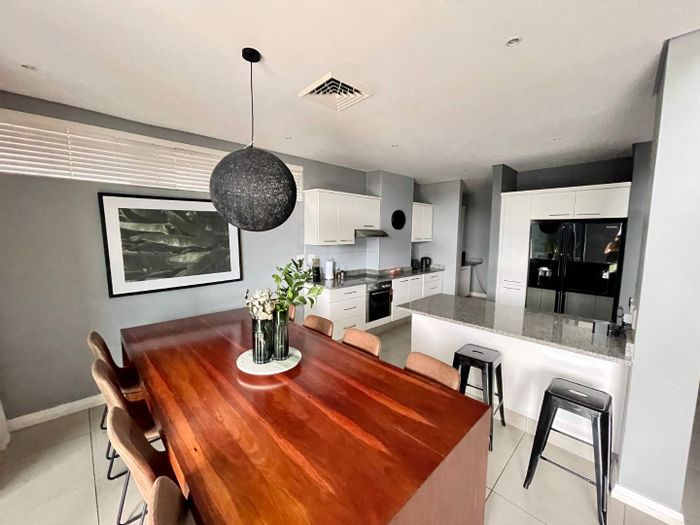 Sunset-filled balcony and open-plan living in vibrant Umhlanga, with panoramic sea views perfect for braais. Modern kitchen, master en suite, three beds, two baths, two garages.