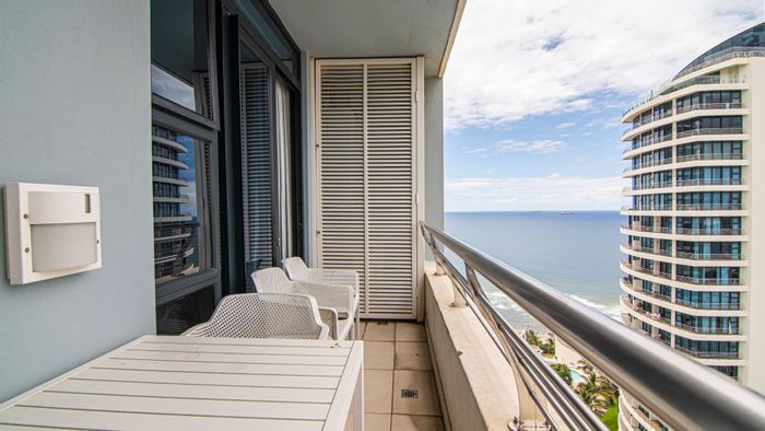 Wake up to endless Indian Ocean views from a furnished studio balcony in Pearls of Umhlanga, with direct mall and hotel access, heated pools, 24-hour security and parking.