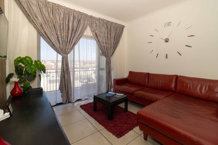 Balcony living with Table Mountain views in a family-friendly complex near Sandown Mall and top schools; pool, kids' park, two bedrooms, two bathrooms and two covered parking bays.