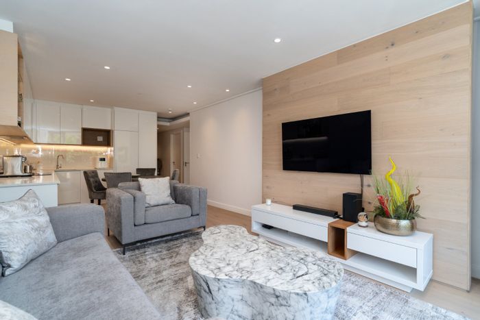 Embrace village living steps from Newlands Village with Table Mountain views, open-plan first-floor apartment featuring a designer kitchen with integrated appliances, communal pool and two basement parking bays.