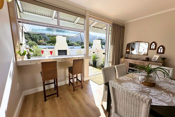 Coastal living in secure Plettenberg Bay estate — stroll to a Blue Flag beach. North-facing wraparound balcony overlooks landscaped gardens and pool; includes self-contained flatlet for guests.