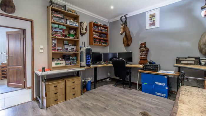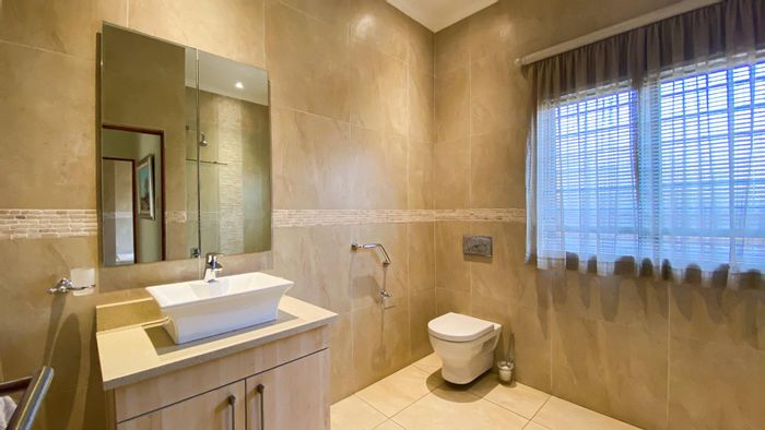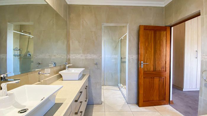 Secure golf-estate living with entertaining at its heart — indoor bar and built-in braai leading to patio and splash pool. Four bedrooms (three en-suite), 3.5 baths, double garage.