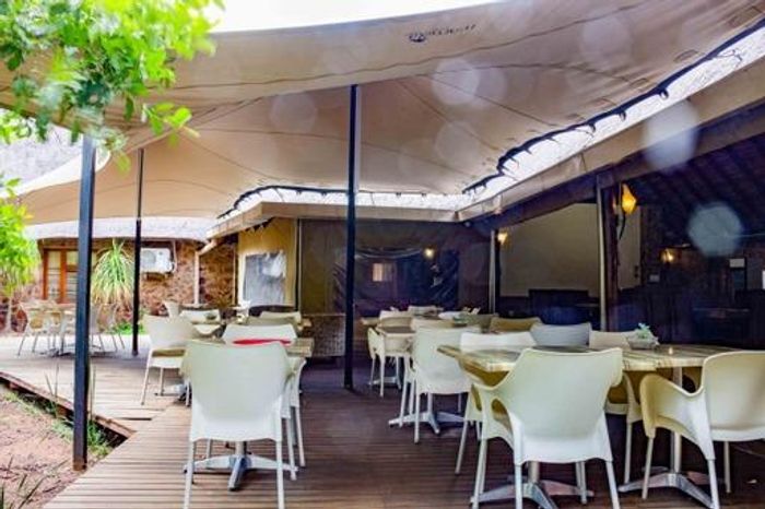 Property includes 4 chalets, 6 glamping tents, restaurant for 32, function hall for 200, on 177 ha in Dinokeng.