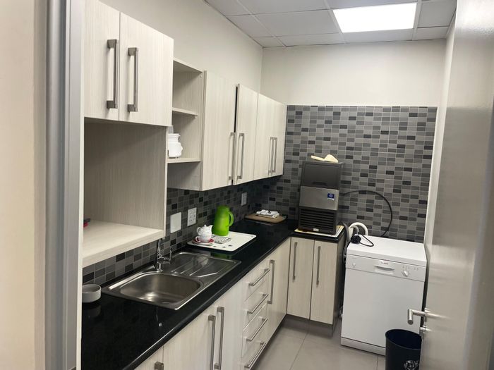 Elevate your company base in secure Kyalami Business Park, Midrand — productive open-plan office with light-filled boardroom overlooking landscaped park, private kitchen and two bathrooms.