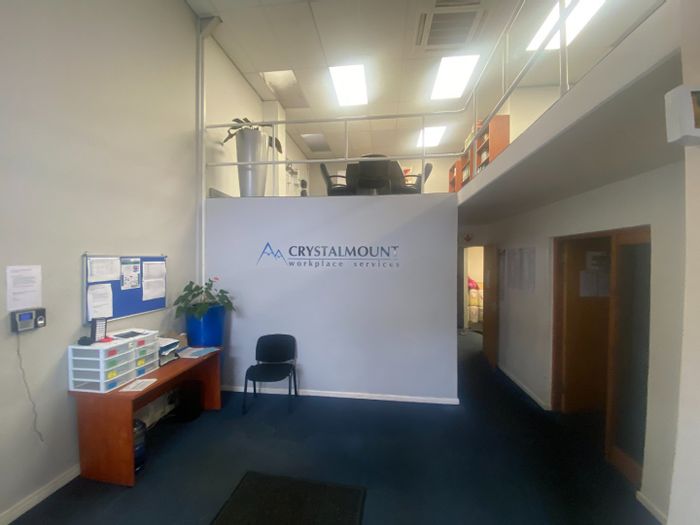 Bright, refurbished ground-floor unit in a secure, well-managed business park — open-plan workspace with high ceilings, two entrances, kitchenette, two ablutions and six dedicated parking bays.