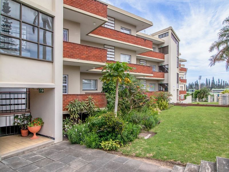 Wake to ocean breezes and golf-course vistas in East London, with enclosed sunroom for seaside relaxation, communal pool access, two bedrooms, one bathroom and lock-up garage.