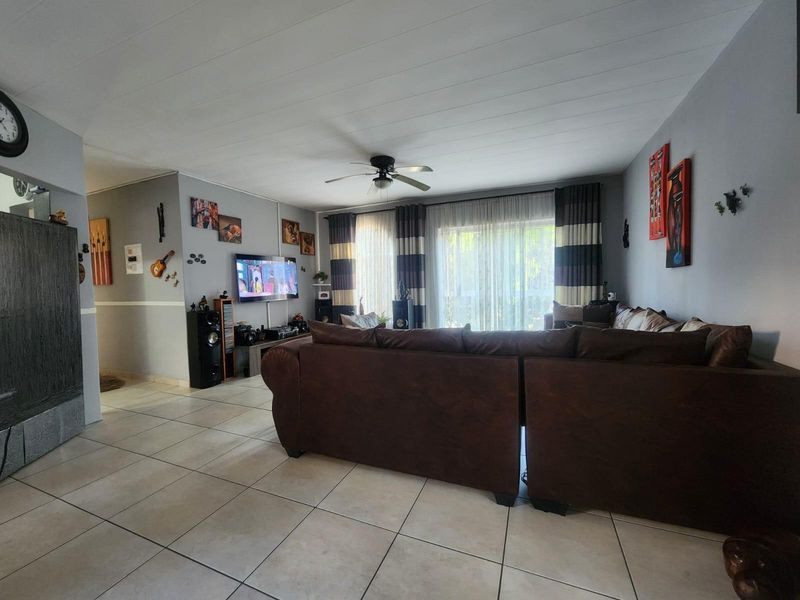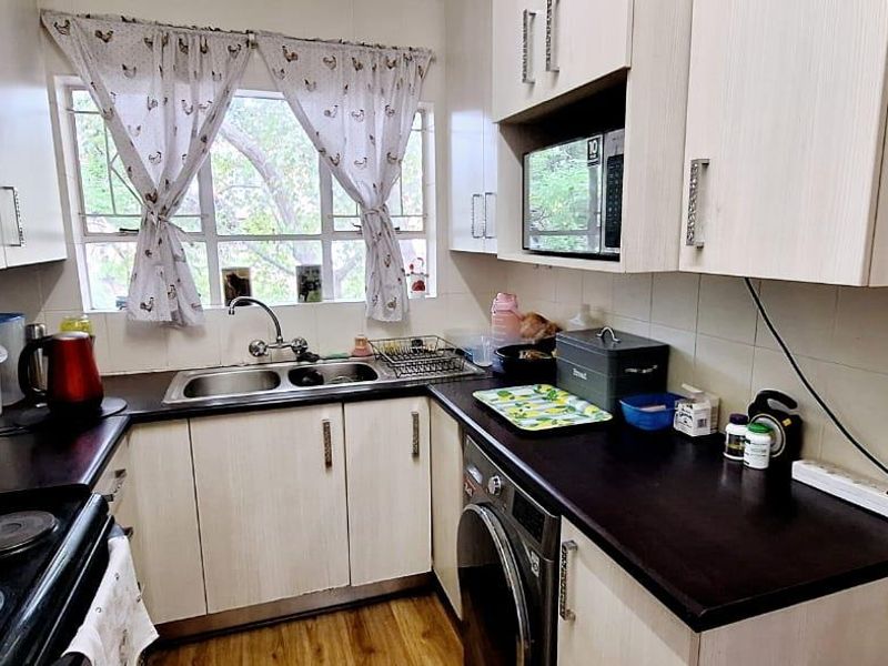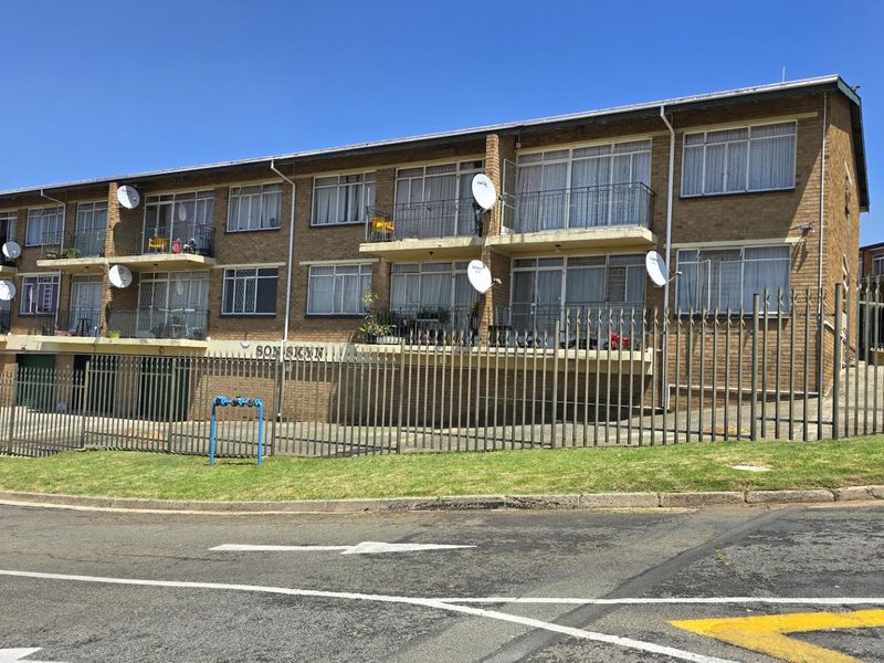 Relaxed Southcrest living with open-plan lounge and dining, tiled floors throughout, and a secure gated complex with kiddies' play area. Includes two bedrooms, 1.5 baths and two parking bays.