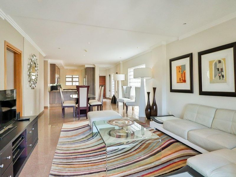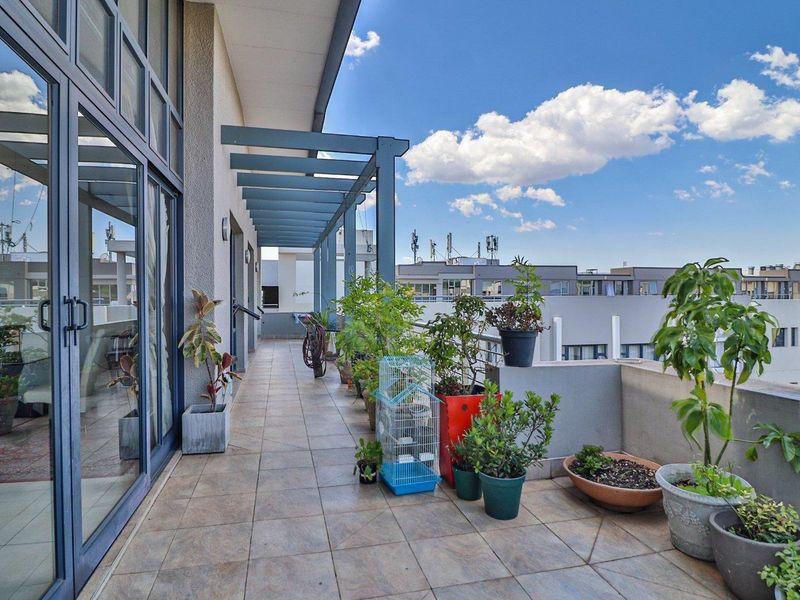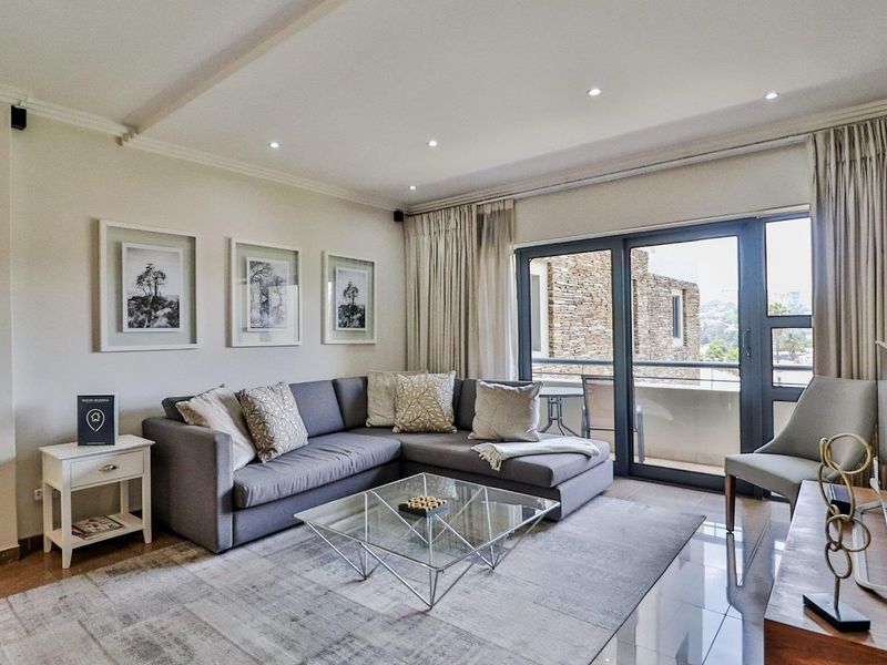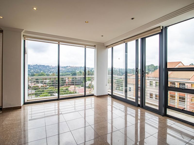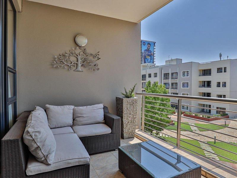 Live vibrant Bedfordview lifestyle above the mall with piazza views and sundowner balcony — renovated north-facing apartment with Miele kitchen, American shutters, two beds, two baths and secure parking.