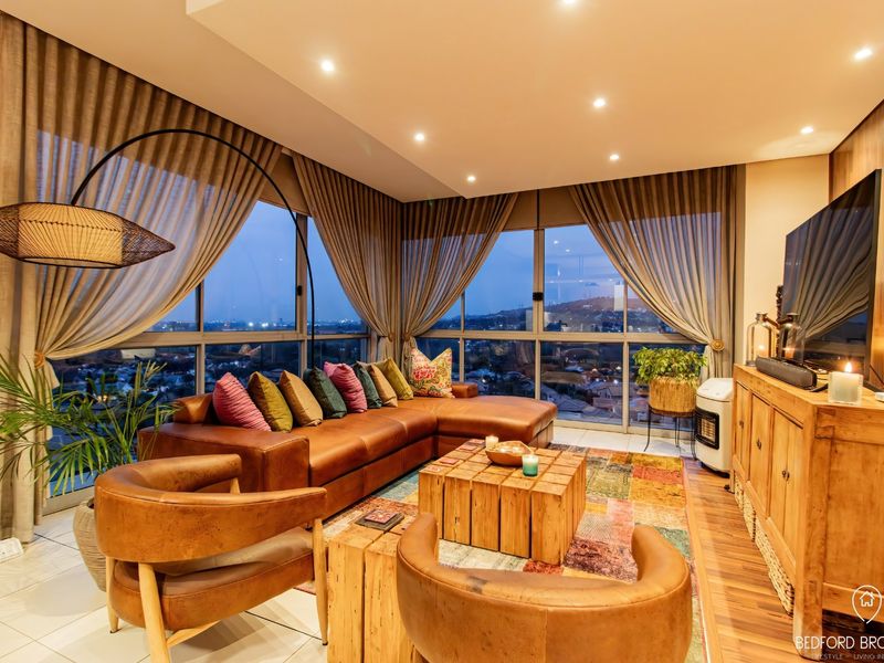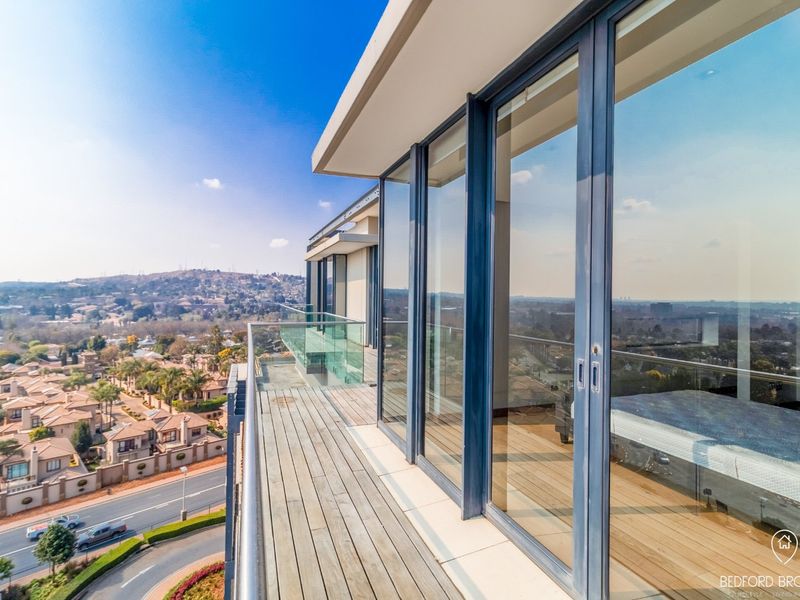 Elevated Bedford Centre living with panoramic Johannesburg views, Weylandts designer furniture, Smeg kitchen and inverter-battery backup. Open-plan with balcony; two beds, two baths and double basement parking.