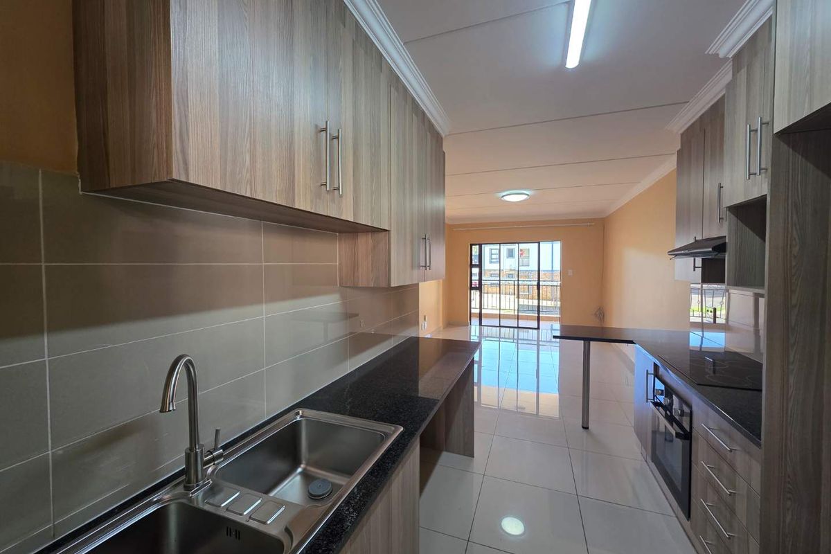 The unit has been freshly painted, giving it a clean, updated look. The modern eat-in kitchen features granite countertops, space for two appliances, and a double-door fridge. The kitchen is tiled up to 80% of the ceiling and seamlessly flows into the open-plan, spacious lounge. The lounge, tiled throughout, opens onto a super-large balcony with a tiled top, perfect for additional built-in cupboards and extra storage space.