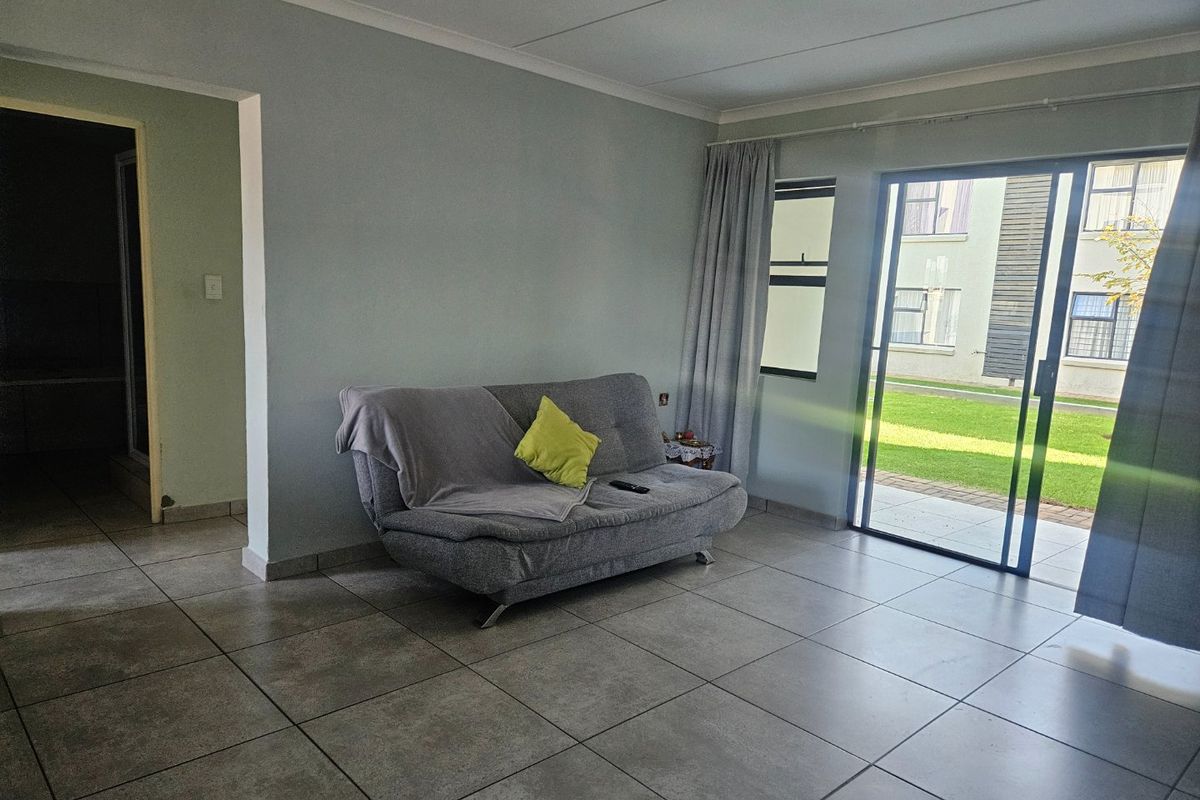 Sunlit corner unit in Boksburg near EastRand Mall offers open-plan living flowing to an enclosed patio with built-in braai and private garden — two bedrooms, one bathroom.