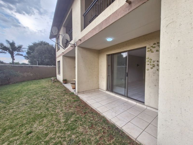 Enjoy secure, community-focused living in Parkrand Boksburg near Carnival City and major malls — first-floor apartment with patio overlooking scenic views, two bedrooms, one bath, covered parking.