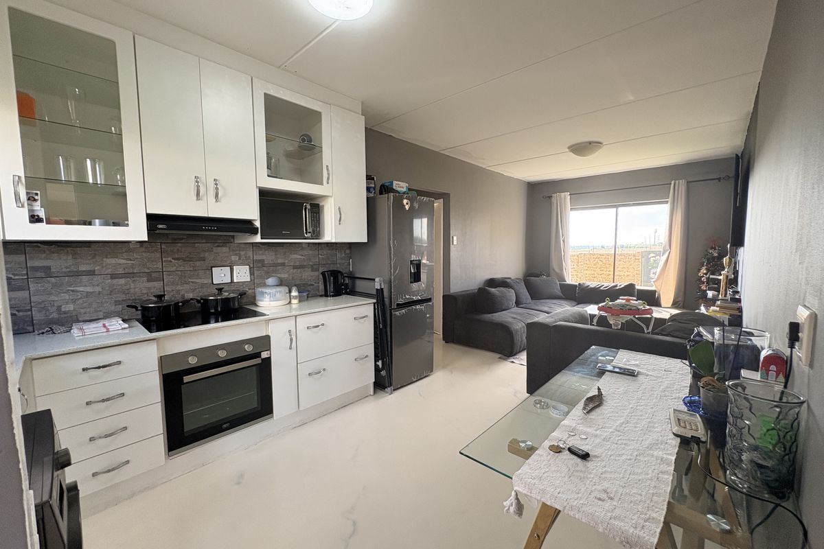 This ground floor 2 bedroom apartment is nestled within a secure estate in Parkrand Boksburg. boasts open plan living; fitted kitchen with quartz...bedrooms fitted with builtin cupboards. The bathroom has a man size tub and fitted shower head for convenience. Morden.Epoxy crafting throughout the entire home.Full bathroom. The lounge overflows onto own private enclosed garden with dedicated garden service once a week.