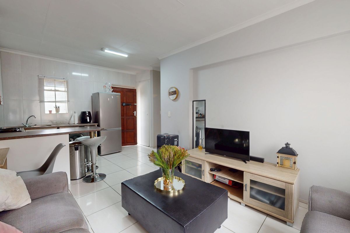 Lock-up-and-go living in central Ravenswood, steps from East Rand Mall and transport, with a modern kitchen featuring built-in cupboards and wine rack, one bed, one bath, two covered parking.
