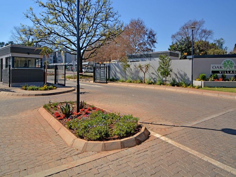 Lock-up-and-go ground-floor corner apartment in Oak Tree Village, steps from Akademia and nearby shops; private patio and energy-efficient upgrades (solar geyser, insulated roof). Two beds, two baths, covered carport.