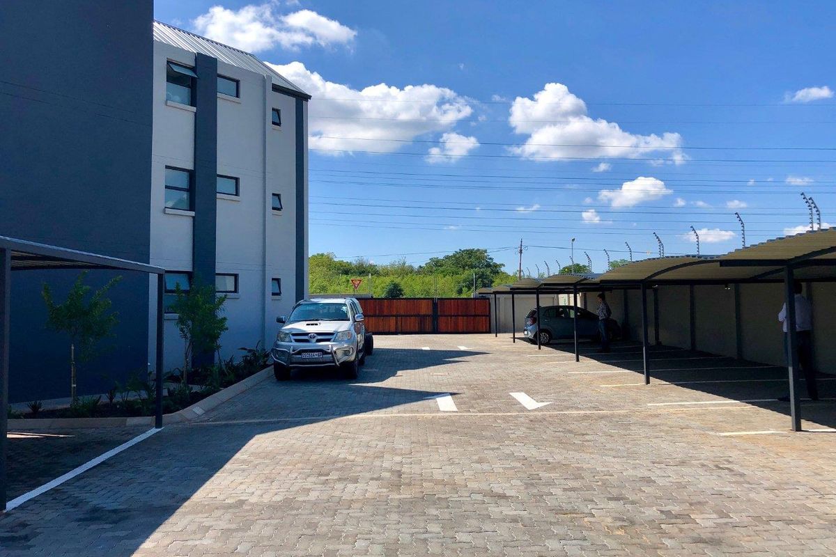 Top-floor unit with open-plan living, high ceilings, kitchenette, shower, covered parking, and access to golf estate amenities. Prepaid electricity.