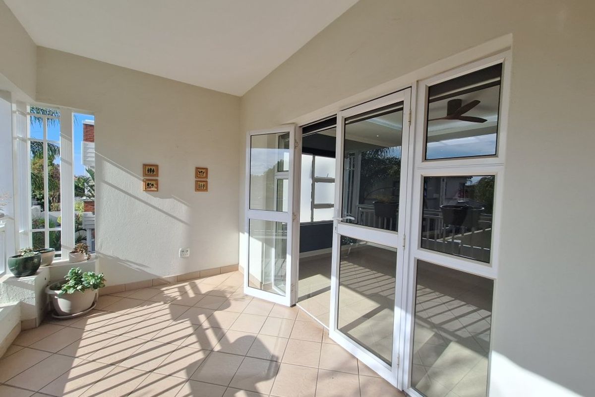 Entertainer's urban retreat in Portland Place, Thorn Valley Estate, Greenstone Hill — calm, secure living with two balconies and built-in braai, open-plan lounge with fireplace; two bedrooms, three baths, single garage.