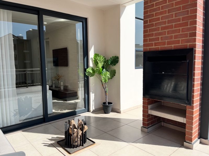 Balcony entertainer’s haven with built‑in braai and bonfire pit, open‑plan living and granite kitchen. Three en‑suite bedrooms, garage, pool, gym and Gautrain/airport access.
