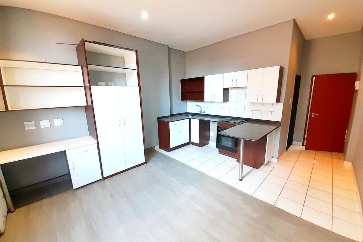 Energetic city living steps from Wits and Braamfontein, perfect for students and lecturers, with a modern kitchen, built-in wardrobe and panoramic city views — one bathroom studio.