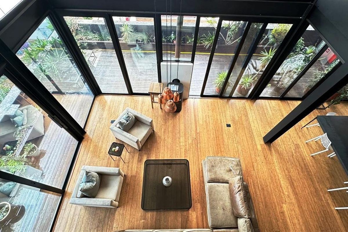 Live in vibrant Maboneng, Johannesburg, with creative urban energy, panoramic light-filled views and a modern kitchen — a penthouse often used for film shoots; two bedrooms, 1.5 baths.