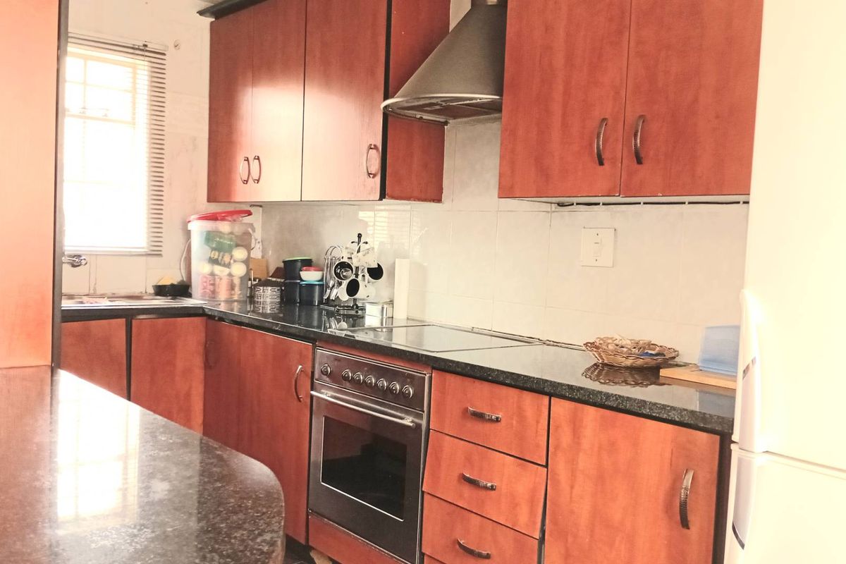 The property features 3 bedrooms, all fitted with built-in cupboards. The main bedroom has an en-suite bathroom, while the other two bedrooms are serviced by a family bathroom.