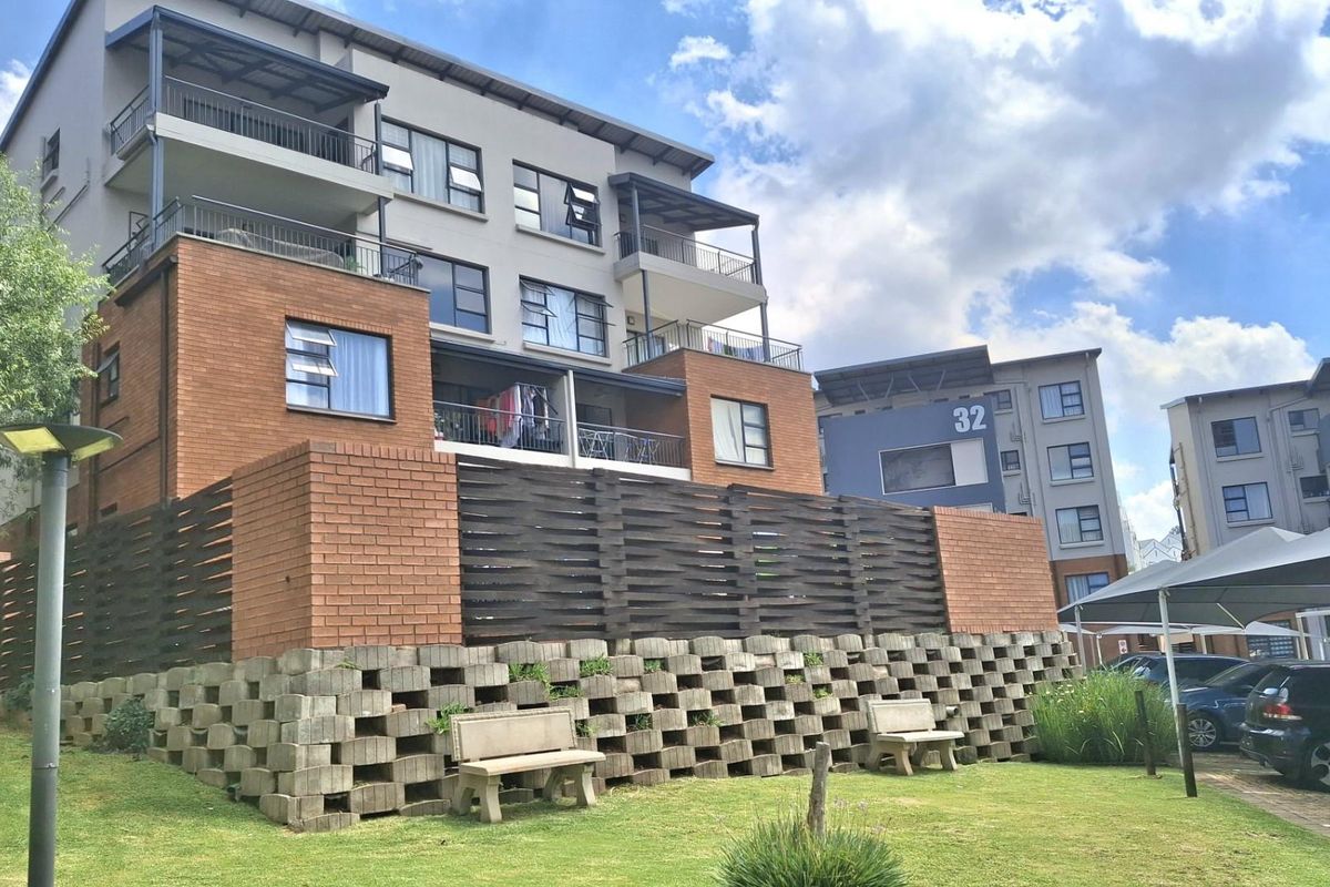 Light-filled top-floor apartment offering airy open-plan living and peaceful privacy in Central Park, Oakdene. Clerestory window and high ceilings frame sky views; two beds, two baths, pool.