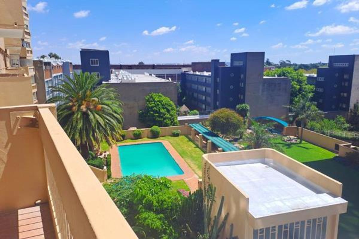 City-edge living in Parktown with easy access to Wits University, hospitals and transport; large open-plan lounge opens to balcony views, communal pool, braai area, two bedrooms, one bathroom, single garage.