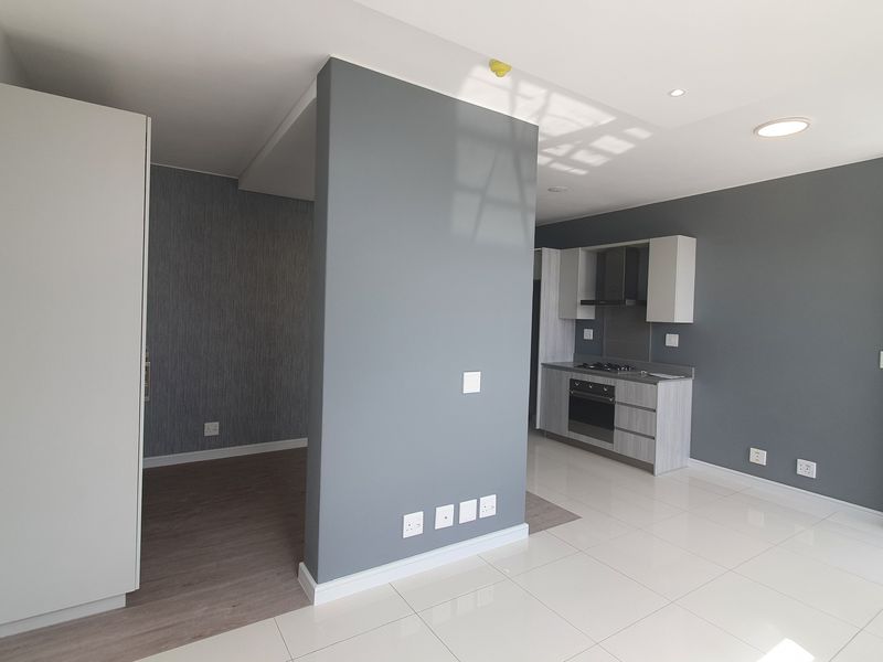 Live opposite Rosebank Mall with easy Gautrain access — fresh 8th-floor breezes, open-plan living, unique kitchen sink and semi-wall bedroom; one bedroom, one bath, basement parking.