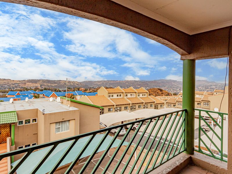 Sunlit first-floor apartment in Amari Heights—work-from-home haven with private balcony and panoramic Winchester Hills views, near Klipriviersberg Reserve; two bedrooms, one bath, two covered parking.